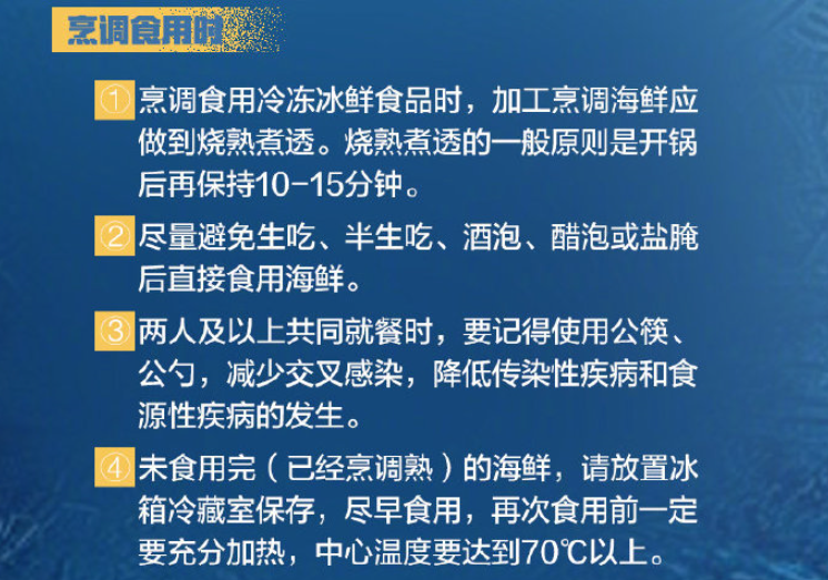 烹調(diào)食用冷凍冰鮮食品時,加工烹調(diào)海鮮應做到燒熟煮透。燒熟煮透的一般原則是開鍋后再保持10-15分鐘。